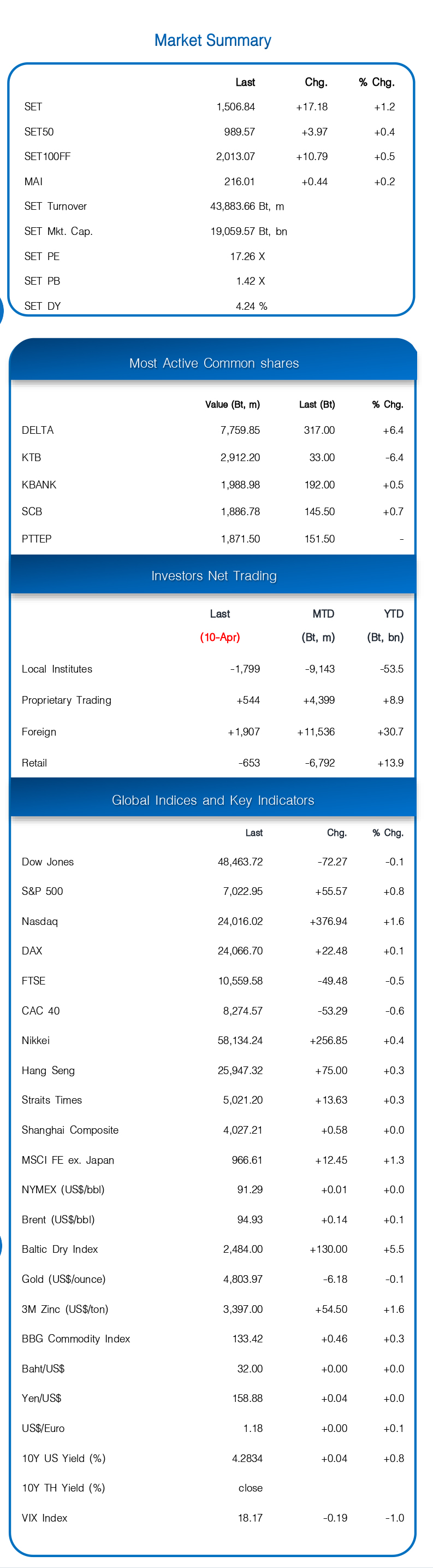 DELTA ปิดนิวไฮ – SET แกว่งแดนบวกในกรอบ 1494-1510 แต่ซื้อขายแผ่วลงเหลือ 4.38 หมื่นลบ. นลท.ชะลอการลงทุนก่อนหยุดยาวสงกรานต์ และรอติดตามการเจรจาระหว่างสหรัฐฯ-อิหร่านที่ปากีสถาน แต่หุ้น DELTA +6.4% มีผลต่อ SET +19 จุด ต่างชาติพลิกซื้อสุทธิ 1.9 พันลบ. และ Long S50 Futures 20,000 สัญญา 2 วันติด