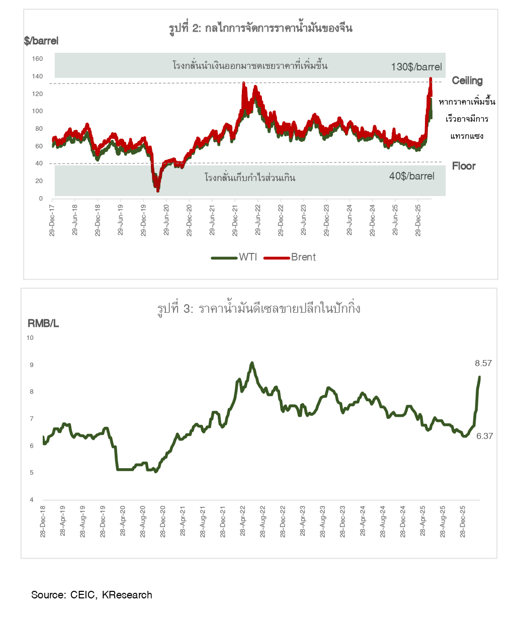 สถานการณ์ความขัดแย้งในตะวันออกกลางคาดส่งผลกระทบทางตรงต่อเศรษฐกิจจีนจำกัด โดยจีนมีการควบคุมการส่งผ่านต้นทุนพลังงานที่สูงขึ้นไปยังผู้บริโภค ซึ่งกลไกการปรับราคาน้ำมันของจีนจะมีการกำหนด Ceiling และ Floor (รูปที่ 2) หากระดับราคาน้ำมันโลกปรับขึ้นเหนือระดับ Ceiling ราคาน้ำมันขายปลีกจะไม่ถูกปรับขึ้นเกินระดับนี้ หรือในกรณีที่ราคาน้ำมันผันผวนเร่งตัวขึ้นสูง ภาครัฐจะเข้ามาจัดการควบคุมราคาน้ำมันไม่ให้พุ่งเร็วเกินไป โดยตั้งแต่ต้นปี 2026 ราคาน้ำมันโลกปรับขึ้นมากว่า 100% แต่ราคาน้ำมันดีเซลในเมืองปักกิ่งปรับขึ้นราว 30%