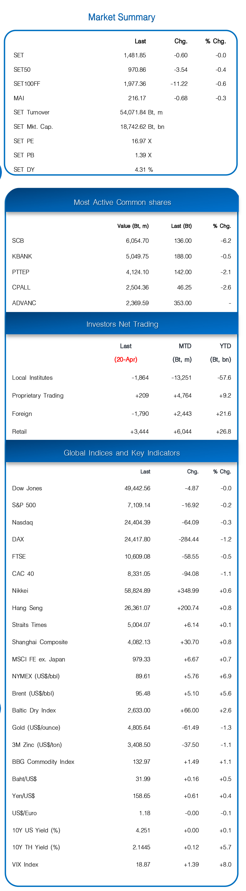 รอการเจรจา – SET แกว่ง +/- ในกรอบแคบ 1472-84 ปิดอ่อนลงเล็กน้อย มูลค่าซื้อขายแผ่วลงแตะ 5.4 หมื่นลบ. นลท.ชะลอลงทุนรอติดตามสถานการณ์ตะวันออกกลางและการเจรจาสหรัฐฯ-อิหร่าน, การขึ้น XD ของหุ้น SCB, CPAXT ถ่วงตลาดด้วย ต่างชาติขายสุทธิ 1.79 พันลบ. 3 วันติด แต่พลิก Long S50 Futures 1,018 สัญญา