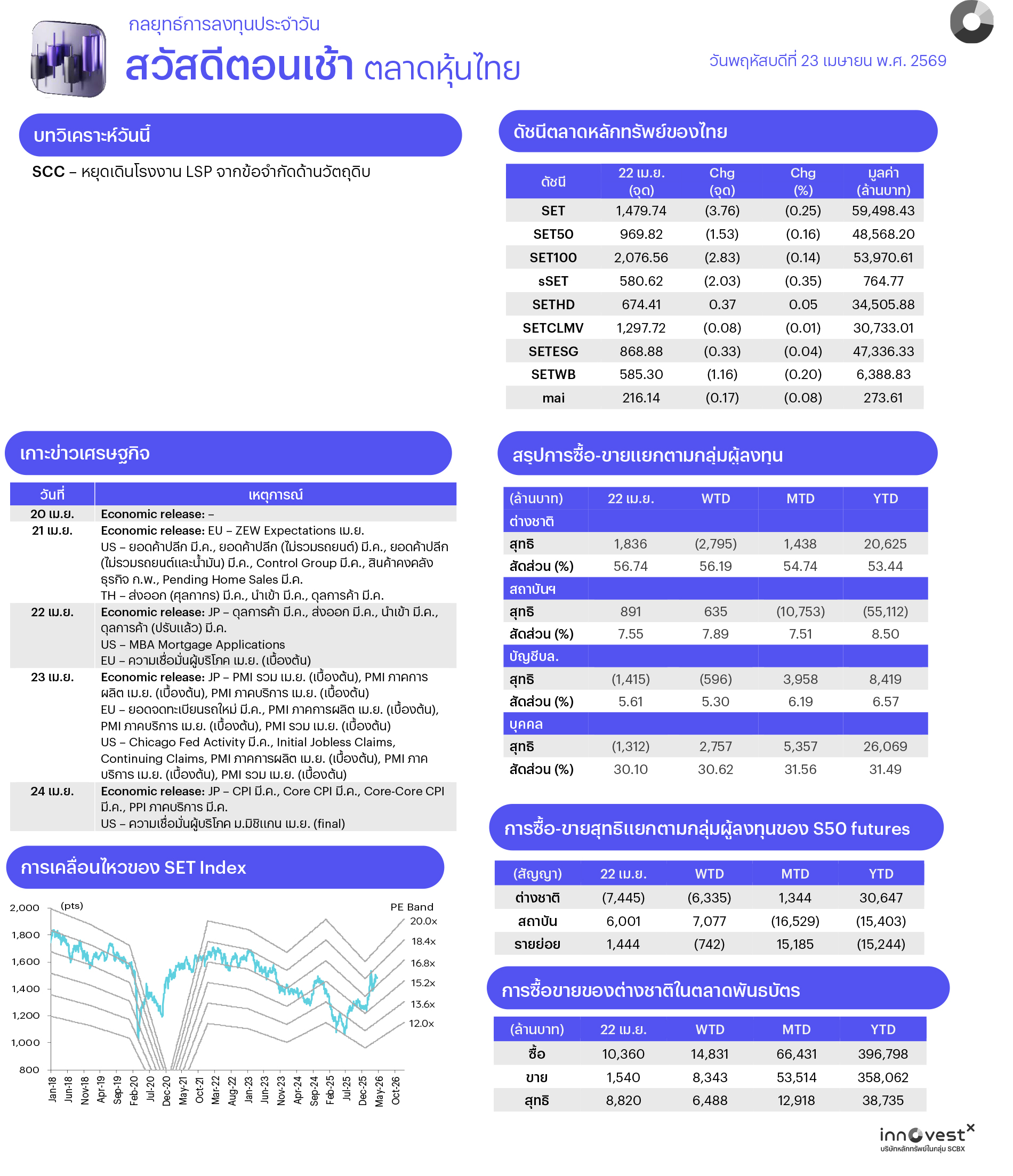 คาด SET แกว่งตัวฟื้นขึ้น หุ้นกลุ่มอิเล็กฯ คาดได้แรงหนุนจากหุ้น Tech สหรัฐฯ รวมทั้งราคาน้ำมันเริ่มขยับขึ้นน่าจะกลับมาหนุนหุ้นพลังงานต้นน้ำ นักลงทุนน่าจะหันมาให้น้ำหนักกับปัจจัยในประเทศ ทั้งมาตรการพยุงเศรษฐกิจและการรายงานงบฯ มากขึ้น หลังสถานการณ์ตะวันออกกลางยังไม่มีความคืบหน้าอย่างมีนัย โดยเฉพาะการเจรจาสันติภาพรอบสองที่ยังต้องจับตาว่าจะเกิดขึ้นในสัปดาห์นี้หรือไม่ ทำให้ดัชนียังเคลื่อนไหวกรอบจำกัด ทางเทคนิค หากดัชนียืนเหนือ 1470 ได้ มองยังดีอยู่