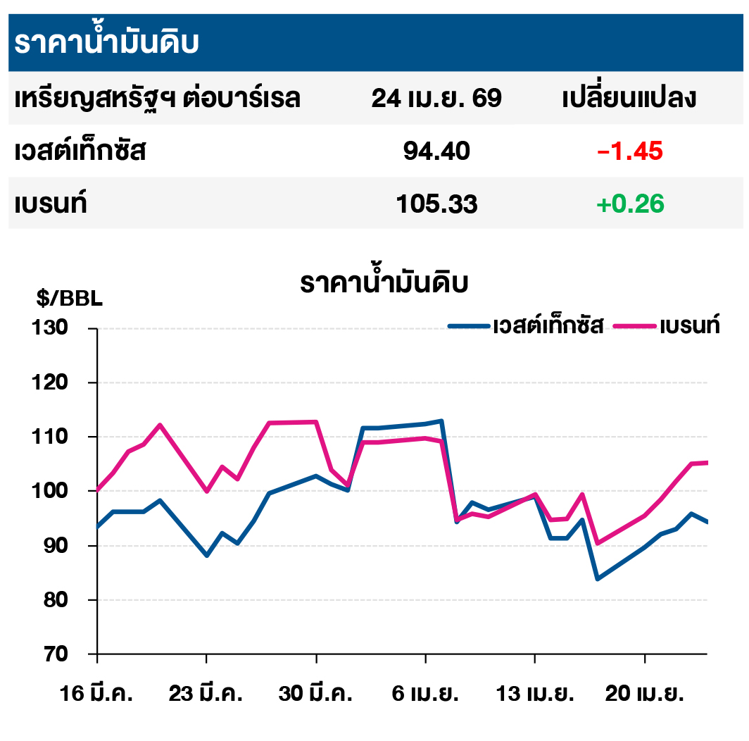 (-/+) ราคาน้ำมันดิบปรับเวสต์เท็กซัส (WTI) ปรับลดลง สวนทางกับราคาน้ำมันดิบเบรนท์ (Brent) ที่ปรับเพิ่มขึ้น จากความกังวลเกี่ยวกับสงครามที่ยังคงยืดเยื้อ ส่งผลให้อุปทานน้ำดิบยังคงตึงตัว หลังการเจรจายุติสงครามระหว่างสหรัฐฯ และอิหร่านล้มเหลวไปเมื่อต้นสัปดาห์ อย่างไรก็ตาม ตลาดยังคงจับตามองการเจรจายุติสงครามระหว่างสหรัฐฯ และอิหร่าน หลังสำนักข่าวรอยเตอร์ รายงานว่า รมว.ต่างประเทศของอิหร่าน นายอับบาส อาราคชี จะเดินทางถึงกรุงอิสลามาบัด ในช่วงเย็นวันศุกร์ที่ 1 พ.ค. 69 เพื่อหารือเกี่ยวกับข้อเสนอการยุติสงครามกับสหรัฐฯ อีกครั้ง