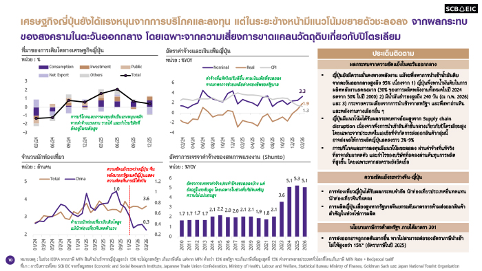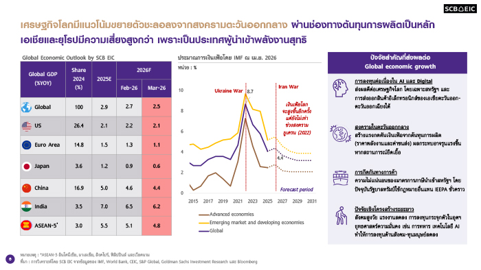 SCB EIC ประเมินเศรษฐกิจโลกปี 2569 จะขยายตัวชะลอลงมาอยู่ที่ 2.5% จาก 2.9% ในปี 2568 โดยได้รับแรงกดดันจากความขัดแย้งในตะวันออกกลาง ผ่านต้นทุนพลังงานและวัตถุดิบที่สูงขึ้น เศรษฐกิจสหรัฐฯ มีแนวโน้มชะลอลงตามการจ้างงานภาคเอกชนที่อยู่ในระดับต่ำ ความเชื่อมั่นผู้บริโภคที่ปรับลดลง เศรษฐกิจยูโรโซน ชะลอลงจากภาคการผลิต แม้ผลกระทบจะยังจำกัดกว่าช่วงสงครามรัสเซีย-ยูเครนในปี 2565 เศรษฐกิจจีน ได้รับผลกระทบจากความขัดแย้งในตะวันออกกลางค่อนข้างจำกัด เนื่องจากมีความมั่นคงทางพลังงานสูง แต่ยังมีแนวโน้มชะลอลงจากอุปสงค์ในประเทศที่ซบเซา เศรษฐกิจญี่ปุ่น ได้รับแรงหนุนจากการบริโภคและการลงทุนในช่วงต้นปี อย่างไรก็ดี ความเสี่ยงการขาดแคลนวัตถุดิบอาจเริ่มกดดันภาคการผลิตในระยะถัดไป