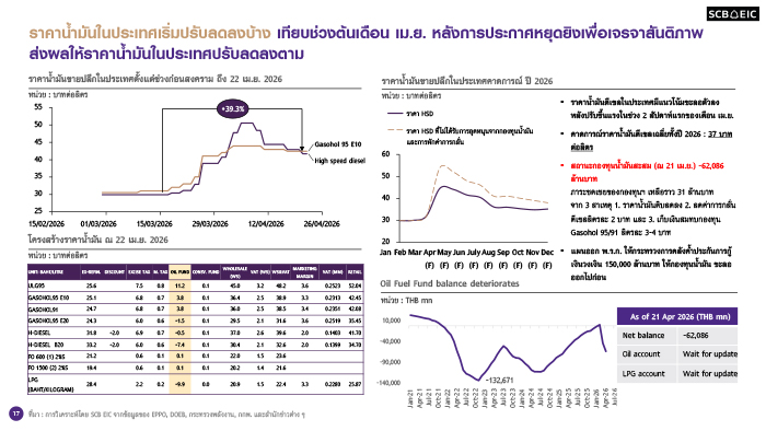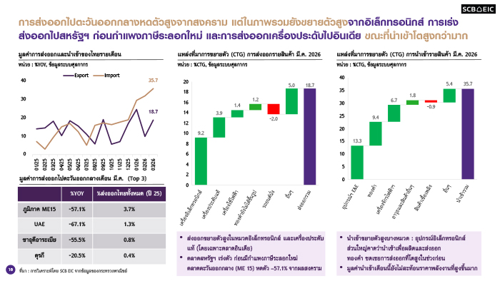 ข้อมูลล่าสุดพบว่าความขัดแย้งในตะวันออกกลางเริ่มกระทบเศรษฐกิจไทยชัดเจนขึ้น โดยเฉพาะภาคท่องเที่ยว จำนวนนักท่องเที่ยวต่างชาติเข้าไทยในต้นเดือน เม.ย. ลดลงชัดเจน กลุ่มที่ได้รับผลกระทบมากคือนักท่องเที่ยวตะวันออกกลางและยุโรป ขณะที่นักท่องเที่ยวในภาพรวมมีแนวโน้มได้รับผลกระทบต่อเนื่องจากต้นทุนเดินทางที่สูงขึ้น ด้านมูลค่าการส่งออกไปตะวันออกกลางเดือน มี.ค. หดตัวสูง แต่ภาพรวมยังโตดีจากอิเล็กทรอนิกส์และการเร่งผลิตและส่งออกไปสหรัฐฯ ในช่วงที่กำแพงภาษีลดลงมาก อย่างไรก็ดี มูลค่าการนำเข้าขยายตัวสูงกว่ามาก แม้ยังไม่สะท้อนมูลค่าการนำเข้าพลังงานที่สูงขึ้นกว่าปกติในด้านราคา
