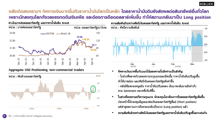 SCB EIC ประเมินว่า กนง. จะคงอัตราดอกเบี้ยนโยบายไว้ที่ 1% ในการประชุมวันที่ 29 เม.ย. นี้ และมีแนวโน้มจะใช้นโยบายแบบรอติดตามสถานการณ์ (Wait-and-see) ท่ามกลางความไม่แน่นอนของสถานการณ์ในตะวันออกกลางและข้อจำกัด Policy space โดย กนง. ยังไม่มีความจำเป็นต้องเร่งปรับขึ้นดอกเบี้ยเพื่อตอบสนองต่อความเสี่ยงเงินเฟ้อในทันที เนื่องจากเสถียรภาพด้านต่างประเทศของไทยยังแข็งแกร่ง ความเสี่ยงเงินทุนไหลออกรุนแรงอยู่ในระดับต่ำ เงินบาทที่อ่อนค่าลงยังสามารถบริหารจัดการได้ และจะมีส่วนช่วยภาคส่งออกที่ได้รับผลกระทบจากการแข็งค่าของเงินบาทอย่างมากในปีที่แล้ว ขณะที่เศรษฐกิจไทยยังเปราะบาง ภาวะการเงินยังตึงตัว สะท้อนจากสินเชื่อที่หดตัวและ คุณภาพสินเชื่อที่ยังมีความเสี่ยงสูง ทั้งนี้ ธปท. มีแนวโน้มใช้มาตรการทางการเงินเฉพาะจุดมากขึ้นเพื่อช่วยประคองเศรษฐกิจและบรรเทาผลกระทบต่อภาคส่วนที่ได้รับผลกระทบโดยตรง