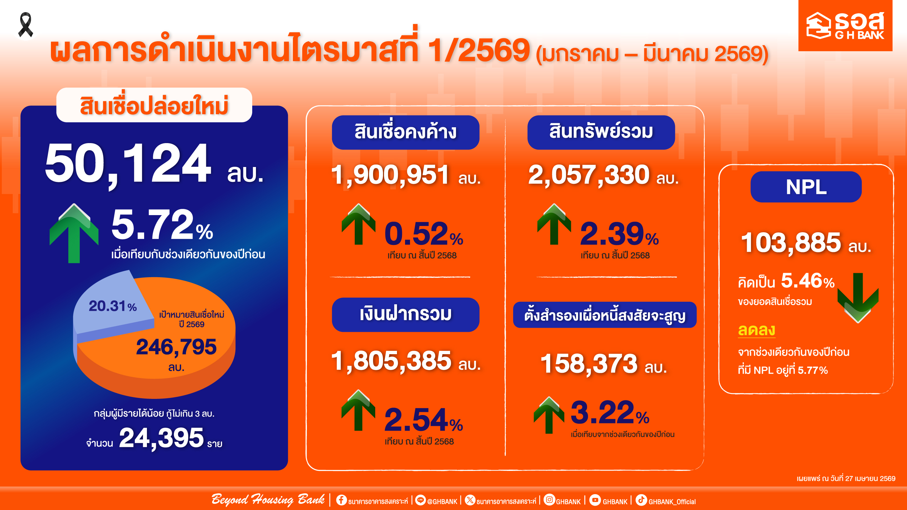 ธนาคารอาคารสงเคราะห์ (ธอส.) เผยผลการดำเนินงานไตรมาสที่ 1 ปี 2569 สามารถปล่อยสินเชื่อใหม่ได้ 50,124 ล้านบาท ดันเม็ดเงินลงสู่ระบบเศรษฐกิจ ขับเคลื่อนภาคอสังหาริมทรัพย์ให้ฟื้นตัว สนับสนุนนโยบายรัฐบาลจัดทำสินเชื่อประหยัดพลังงาน พร้อมออกมาตรการดูแลลูกค้าอย่างต่อเนื่อง ด้วยอัตราดอกเบี้ยที่เหมาะสมและเงื่อนไขผ่อนปรน ให้กู้เพิ่มอัตราดอกเบี้ยเริ่มต้น 1% อีกทั้งยังช่วยรักษาบ้านให้คนไทยได้อย่างยั่งยืนผ่าน 5 Strategic Pillars โดยนำเทคโนโลยี Digital Data และ AI ยกระดับการให้บริการและพัฒนาองค์กรทุกมิติอย่างมีประสิทธิภาพ