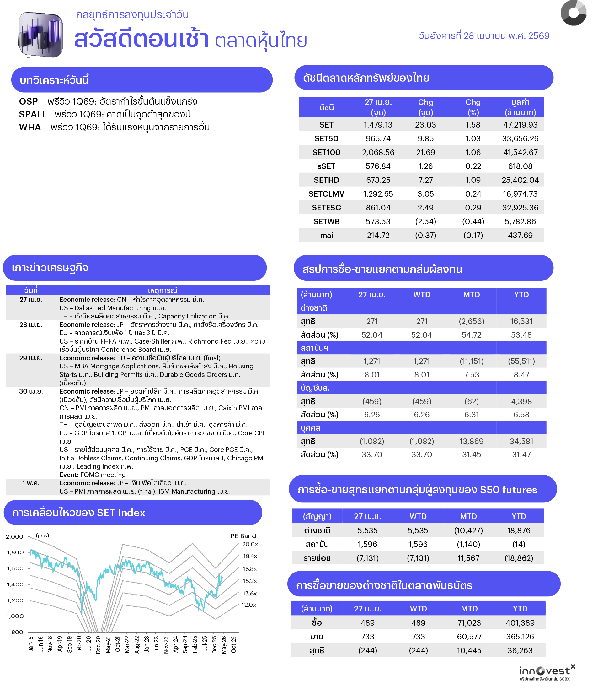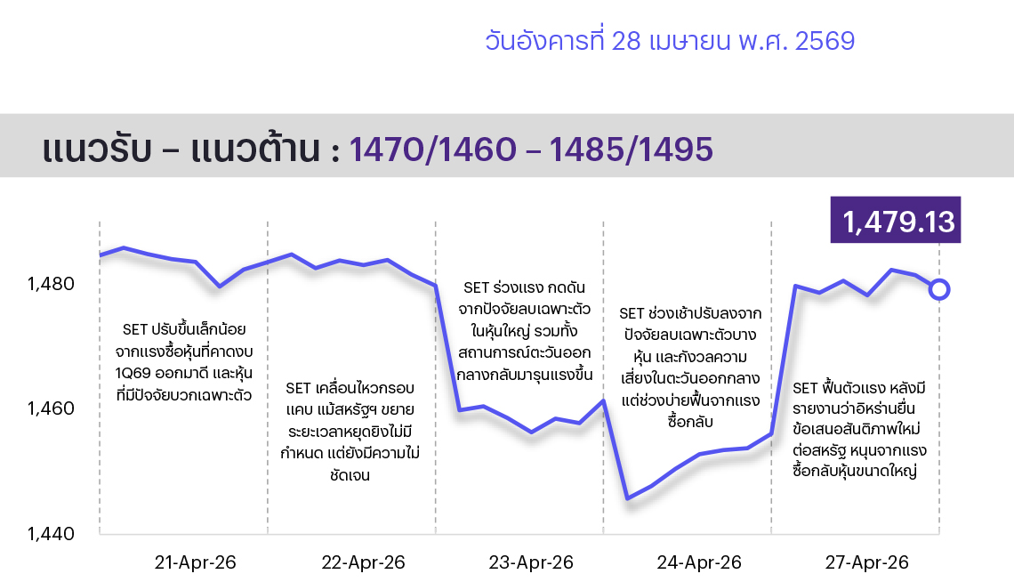 คาด SET แกว่งแคบชะลอตัว นักลงทุนให้น้ำหนักกับการรายงานงบฯ หุ้น Real Sector มากขึ้น รวมทั้งการประชุมธนาคารกลางต่างๆ และ กนง.ในวันพรุ่งนี้ ขณะที่สถานการณ์ตะวันออกกลางยังไม่คืบหน้าอย่างมีนัย มีเพียงรายงานข่าวว่าอิหร่านยื่นข้อเสนอใหม่ต่อสหรัฐฯ เพื่อเปิดช่องแคบฮอร์มุซซึ่งยังต้องรอการพิจารณา อย่างไรก็ตาม อาจต้องระวังแรงขาย sell on fact ในหุ้นที่ปรับขึ้นมามาก ทางเทคนิคดัชนีดีดรีบาวด์ขึ้นหลังไม่หลุด 1450 แต่ประเมินกรอบบนยังจำกัด