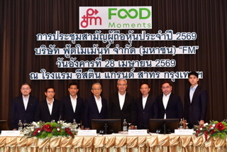 นายเจษฎาวัฒน์ เพรียบจริยวัฒน์ (ที่ 5 จากซ้าย) ประธานกรรมการ นายสนิท ดุษฎีโหนด (ที่ 4 จากซ้าย) ประธานกรรมการบริหาร นายณัฐพล ดุษฎีโหนด (ที่ 3 จากซ้าย) ประธานเจ้าหน้าที่บริหาร นายเชฏฐพล ดุษฎีโหนด (ที่ 2 จากซ้าย) รองประธานเจ้าหน้าที่บริหาร และนายสุเมธ มาสิลีรังสี (ซ้ายสุด) ประธานเจ้าหน้าที่ฝ่ายการเงิน พร้อมด้วยคณะกรรมการ บริษัท ฟู้ดโมเม้นท์ จำกัด (มหาชน) หรือ FM ร่วมประชุมสามัญผู้ถือหุ้นประจำปี 2569 (AGM) โดยผู้ถือหุ้นอนุมัติแผนการจ่ายเงินปันผลเพิ่มเติมจากผลการดำเนินงานงวดครึ่งปีหลัง 2568 ในอัตรา 0.20 บาทต่อหุ้น รวม 197.57 ล้านบาท และเตรียมขึ้นเครื่องหมาย XD วันที่ 7 พฤษภาคม 2569 ซึ่งผู้ถือหุ้นเตรียมรับเงินปันผลเข้าพอร์ตในวันที่ 22 พฤษภาคมนี้ ทั้งนี้ หากรวมกับการจ่ายเงินปันผลระหว่างกาลในอัตรา 0.15 บาทต่อหุ้น เมื่อวันที่ 9 กันยายน 2568 บริษัทฯ จะจ่ายเงินปันผลจากผลการดำเนินงานปี 2568 รวมทั้งสิ้น 0.35 บาทต่อหุ้น เป็นเงิน 345.74 ล้านบาท คิดเป็น 92.9% จากกำไรสุทธิจากงบการเงินเฉพาะกิจการ พร้อมกันนี้บริษัทฯ แจ้งผลการดำเนินงานปี 2568 มีรายได้รวม 7,145 ล้านบาท และกำไรสุทธิ 691 ล้านบาท คิดเป็นอัตรา 9.67% โดยมีปริมาณการขายกลุ่มผลิตภัณฑ์ไก่แปรรูปปรุงสุก (CAV) สูงถึง 22,300 ตัน เติบโต 8.8% สะท้อนถึงความเชื่อมั่นของลูกค้าในตลาดโลก พร้อมทั้งโชว์วิสัยทัศน์เข้าร่วมโครงการ JUMP+ ขับเคลื่อนการเติบโตในระยะ 3 ปีข้างหน้า (2569-2571) มุ่งทรานส์ฟอร์มองค์กรสู่การเป็นผู้ให้บริการโซลูชันอาหารคุณภาพสูง วางเป้าหมายรายได้ปี 2571 กว่า 1 หมื่นล้านบาท