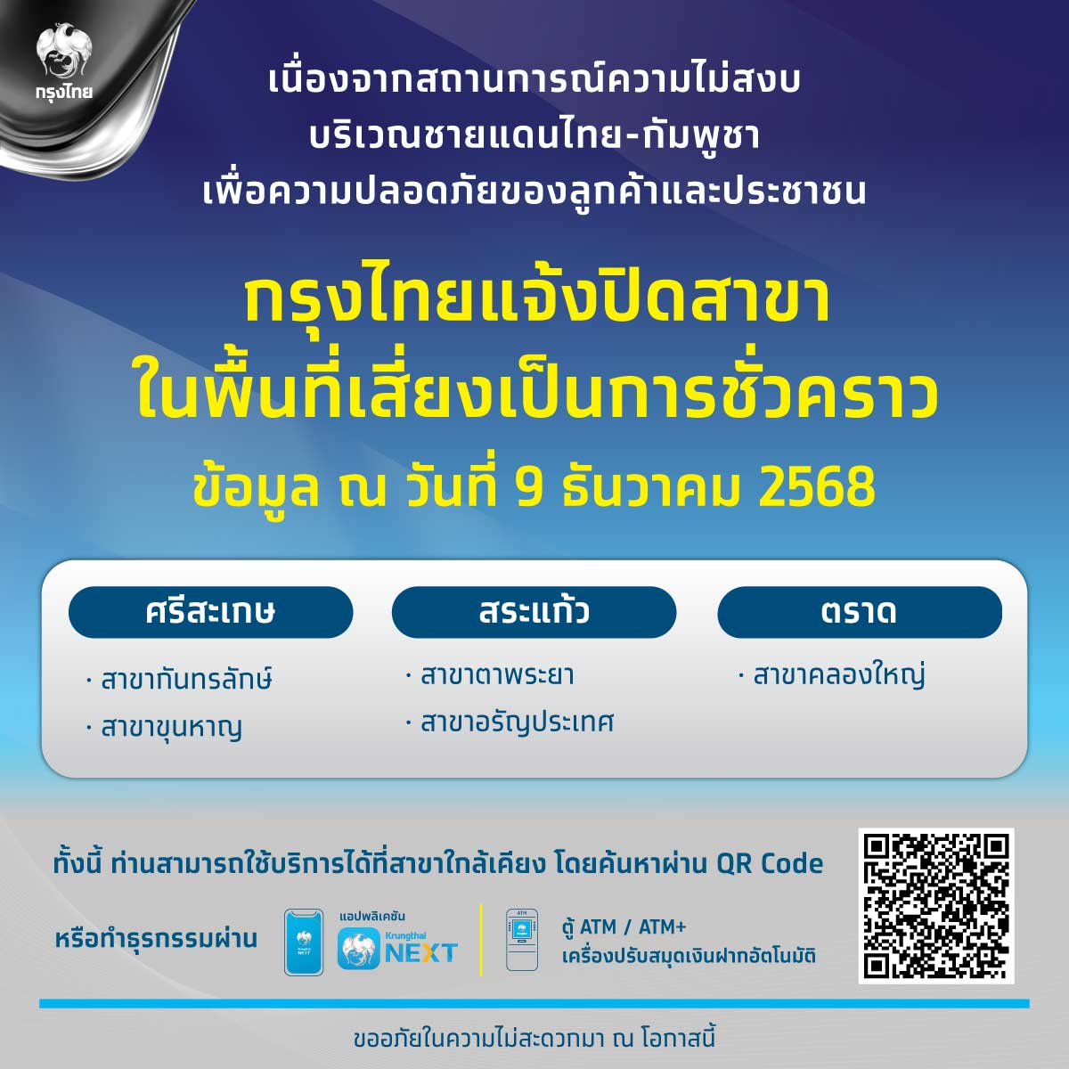เนื่องจากสถานการณ์ความไม่สงบ บริเวณชายแดนไทย-กัมพูชา กรุงไทยขอแจ้งปิดบริการสาขาในพื้นที่เสี่ยงเป็นการชั่วคราว ข้อมูล ณ วันที่ 9 ธันวาคม 2568 ประกอบด้วยสาขา ดังนี้