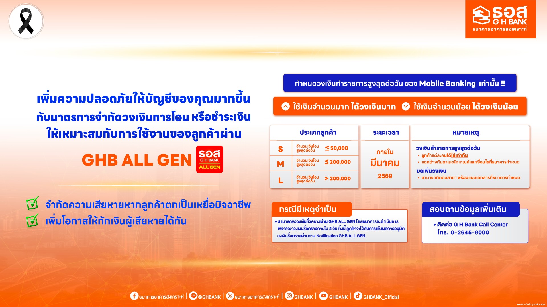 ธนาคารอาคารสงเคราะห์ (ธอส.) เพิ่มความปลอดภัยให้ลูกค้าในการใช้บริการทางการเงินดิจิทัล เดินหน้ายกระดับมาตรการดูแลการโอนและชำระเงินผ่าน Application : GHB ALL GEN โดยกำหนดวงเงินทำรายการต่อวัน เพื่อช่วยลดความเสี่ยงจากการถูกหลอกลวง และป้องกันความเสียหายจากมิจฉาชีพ ซึ่งให้เหมาะสมกับพฤติกรรมการใช้งานของลูกค้าแต่ละกลุ่ม