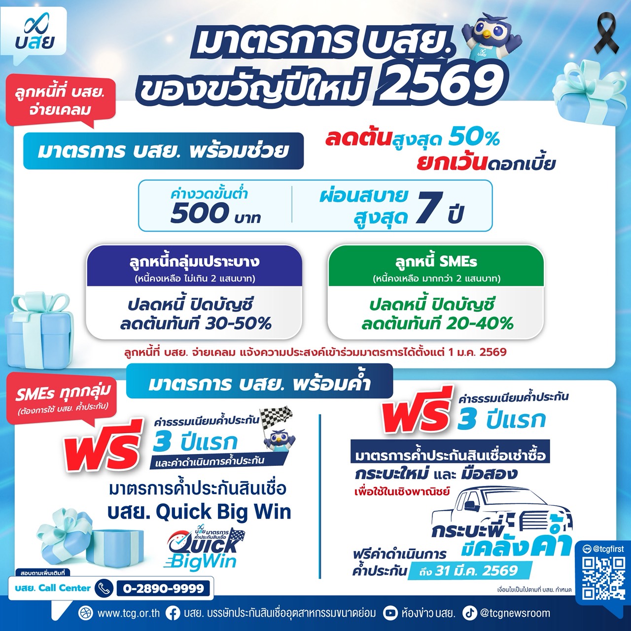 นายสิทธิกร ดิเรกสุนทร กรรมการและผู้จัดการทั่วไป บรรษัทประกันสินเชื่ออุตสาหกรรมขนาดย่อม (บสย.) เปิดเผยว่า บสย. ขานรับนโยบายภาครัฐ มุ่งแก้หนี้ และลดภาระทางการเงินให้กับผู้ประกอบการ SMEs โดยส่งมาตรการของขวัญปีใหม่ 2569 ตอบโจทย์ผู้ประกอบการ SMEs 2 กลุ่ม ได้แก่