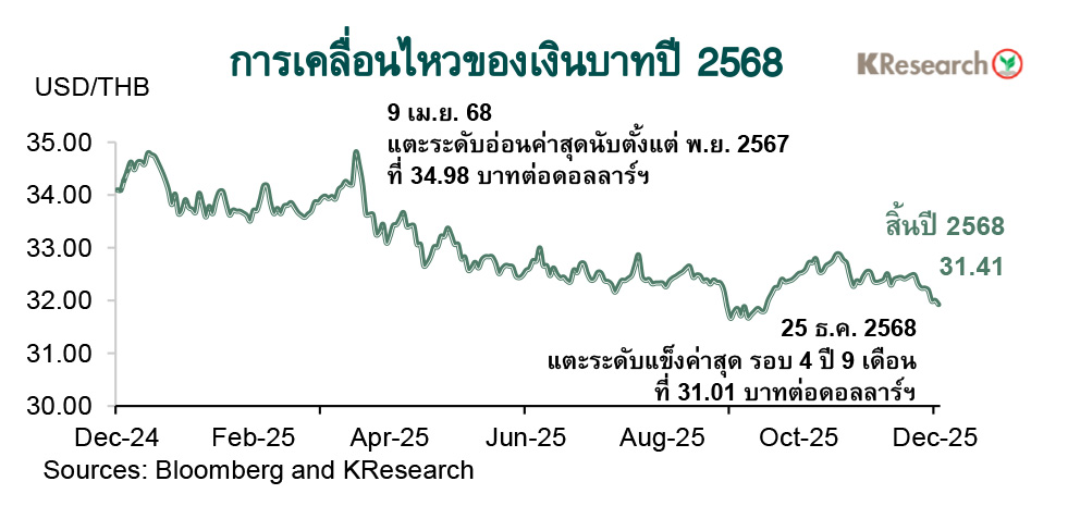 ในสัปดาห์ทำการสุดท้ายของปี 2568 เงินบาทพลิกอ่อนค่า กลับมาแตะระดับอ่อนค่าสุดในรอบ 2 สัปดาห์ที่ 31.67 บาทต่อดอลลาร์ฯ ตามแรงขายทำกำไรทองคำในตลาดโลกและแรงซื้อคืนเงินดอลลาร์ฯ เพื่อปรับโพสิชั่นก่อนสิ้นปี