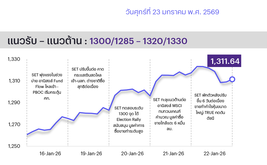 แนวโน้มตลาดวันนี้ ไซด์เวย์-พักฐาน - เริ่มเห็นแรงขายล็อกกำไรหลังตลาดปรับขึ้นมาเร็วในช่วงก่อนหน้านี้ หมุนสู่หุ้นที่ยังขึ้นน้อย - มีปันผลดี ขณะที่งบแบงก์ออกครบแล้วต่ำกว่าตลาดคาด ทำให้นลท.เพิ่มความระมัดวังการประกาศงบในสัปดาห์หน้า แนวรับ 1300-05 แนวต้าน 1330