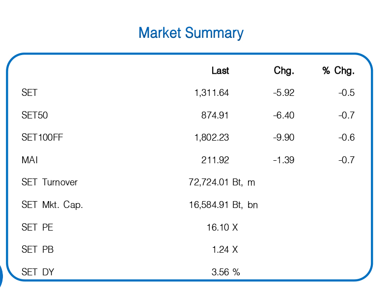 คาดตลาดแกว่งไซด์เวย์/พักตัว นักลงทุนต่างชาติหยุดซื้อต่อเป็นวันที่ 2 ประเด็น TRUE ที่ปรับลงและกดดันตลาด ผบห.ประเมินว่ากลยุทธ์ธุรกิจ-นโยบายเงินปันผลไม่เปลี่ยน แต่ตลาดค่อนข้างระมัดระวังทำให้แรงเทขายเร็ว ปัจจัยภายนอก เงินเฟ้อ PCE สหรัฐฯ ออกมาตามคาด และคาดว่าเฟดคงดอกเบี้ยในการประชุมในสัปดาห์หน้า