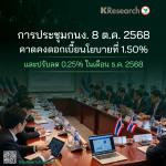 ในการประชุมกนง. วันที่ 8 ต.ค. 2568 ซึ่งถือเป็นการประชุมครั้งแรกภายใต้การกำกับของผู้ว่าการธนาคารแห่งประเทศไทยคนใหม่ คุณวิทัย รัตนากร พร้อมด้วยกรรมการใหม่อีก 2 ท่าน คาดว่าที่ประชุมจะมีมติไม่เป็นเอกฉันท์คงอัตราดอกเบี้ยนโยบายไว้ที่ 1.50% หลังจากได้ปรับลดลง 0.25% ในการประชุมรอบก่อนหน้าเมื่อเดือน ส.ค.