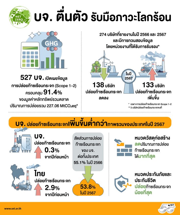 บริษัทจดทะเบียนในตลาดหลักทรัพย์แห่งประเทศไทยและตลาดหลักทรัพย์เอ็ม เอ ไอ (ตลาดหุ้นไทย) 527 บริษัท (จากทั้งหมด 861 บริษัท หรือ 91.4% ของมูลค่าหลักทรัพย์รวมทั้งตลาด) เปิดเผยปริมาณการปล่อยก๊าซเรือนกระจกในปี 2567 ซึ่งมีข้อสรุปที่น่าสนใจ ดังนี้