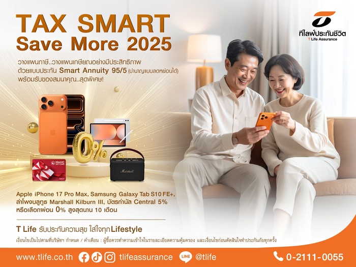 ที ไลฟ์ ประกันชีวิต บริษัทในกลุ่มธนชาต ชวนคนไทยเตรียมความพร้อมสู่ชีวิตหลังเกษียณอย่างมั่นใจ พร้อมใช้สิทธิ์ลดหย่อนภาษีเงินได้บุคคลธรรมดาได้อย่างคุ้มค่าตามที่กรมสรรพากรกำหนด กับแบบประกันบำนาญ Smart Annuity 95/5 รับของสมนาคุณแบบจัดเต็ม ตั้งแต่วันนี้ ? 31 ธันวาคม 2568