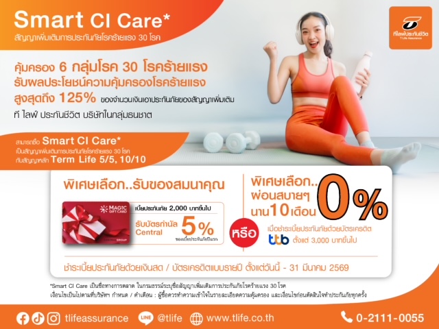 ที ไลฟ์ ประกันชีวิต บริษัทในกลุ่มธนชาต เปิดตัวผลิตภัณฑ์ใหม่ล่าสุด "Smart CI Care" สัญญาเพิ่มเติมการประกันภัยโรคร้ายแรง ที่ให้ความคุ้มครองโรคร้ายแรงรวม 30 โรค จาก 6 กลุ่มโรคสำคัญ ออกแบบมาเพื่อรองรับความเสี่ยงด้านสุขภาพที่เพิ่มขึ้น และช่วยเสริมความมั่นคงทางการเงินให้แก่ผู้เอาประกันและครอบครัว
