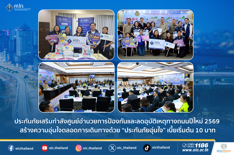วันที่ 29 ธันวาคม 2568 สำนักงาน คปภ. เข้าร่วมเปิดศูนย์อำนวยการป้องกันและลดอุบัติเหตุทางถนนช่วงเทศกาลปีใหม่ พ.ศ. 2569 มุ่งเน้นการบูรณาการความปลอดภัยทุกภาคส่วน พร้อมส่งเสริมการใช้ระบบประกันภัยเป็นเครื่องมือบริหารความเสี่ยง ให้ประชาชนเดินทางอย่างมั่นใจ