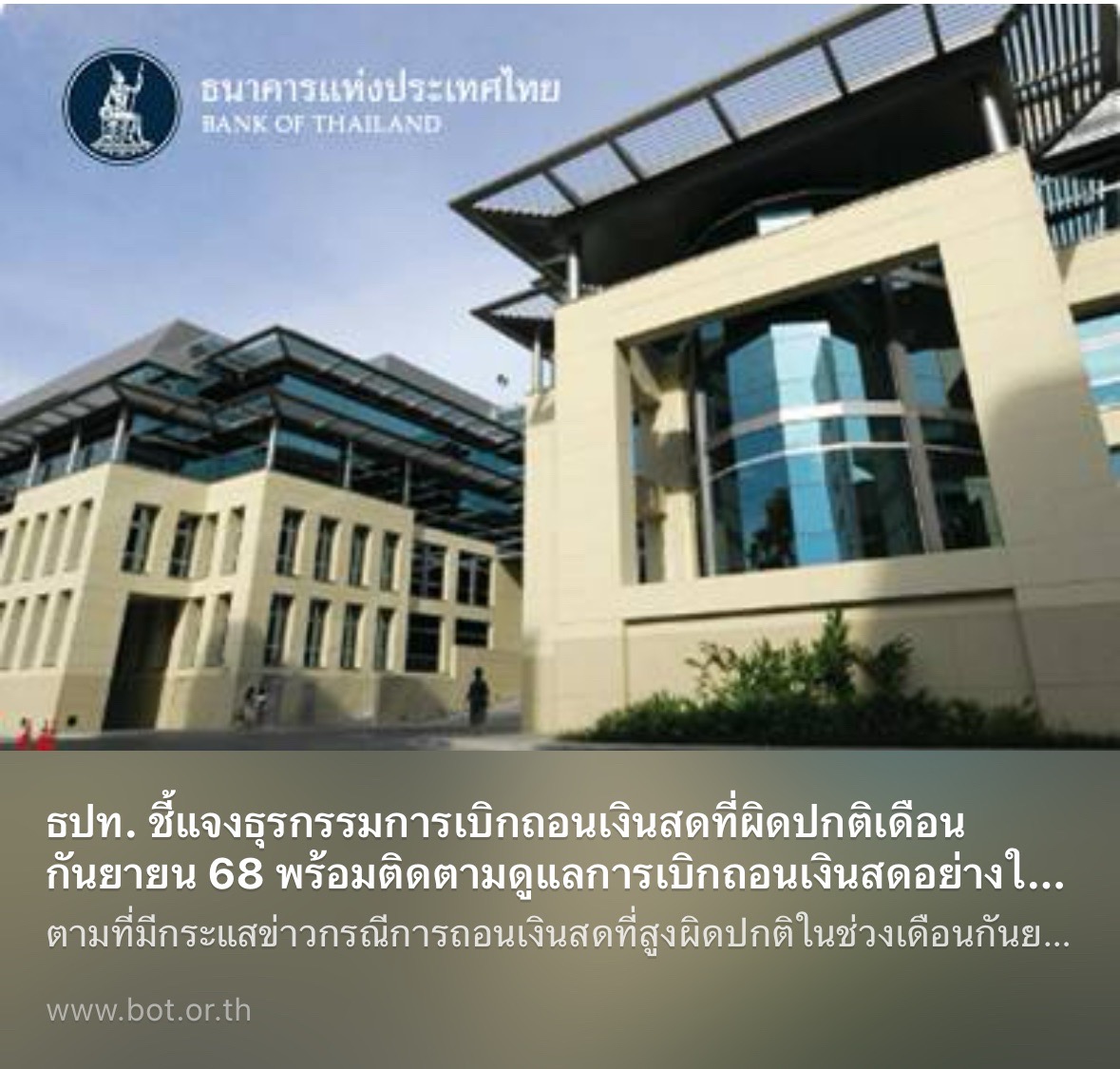 ธปท. ชี้แจงธุรกรรมการเบิกถอนเงินสดที่ผิดปกติเดือนกันยายน 68 พร้อมติดตามดูแลการเบิกถอนเงินสดอย่างใกล้ชิดในช่วงเลือกตั้ง