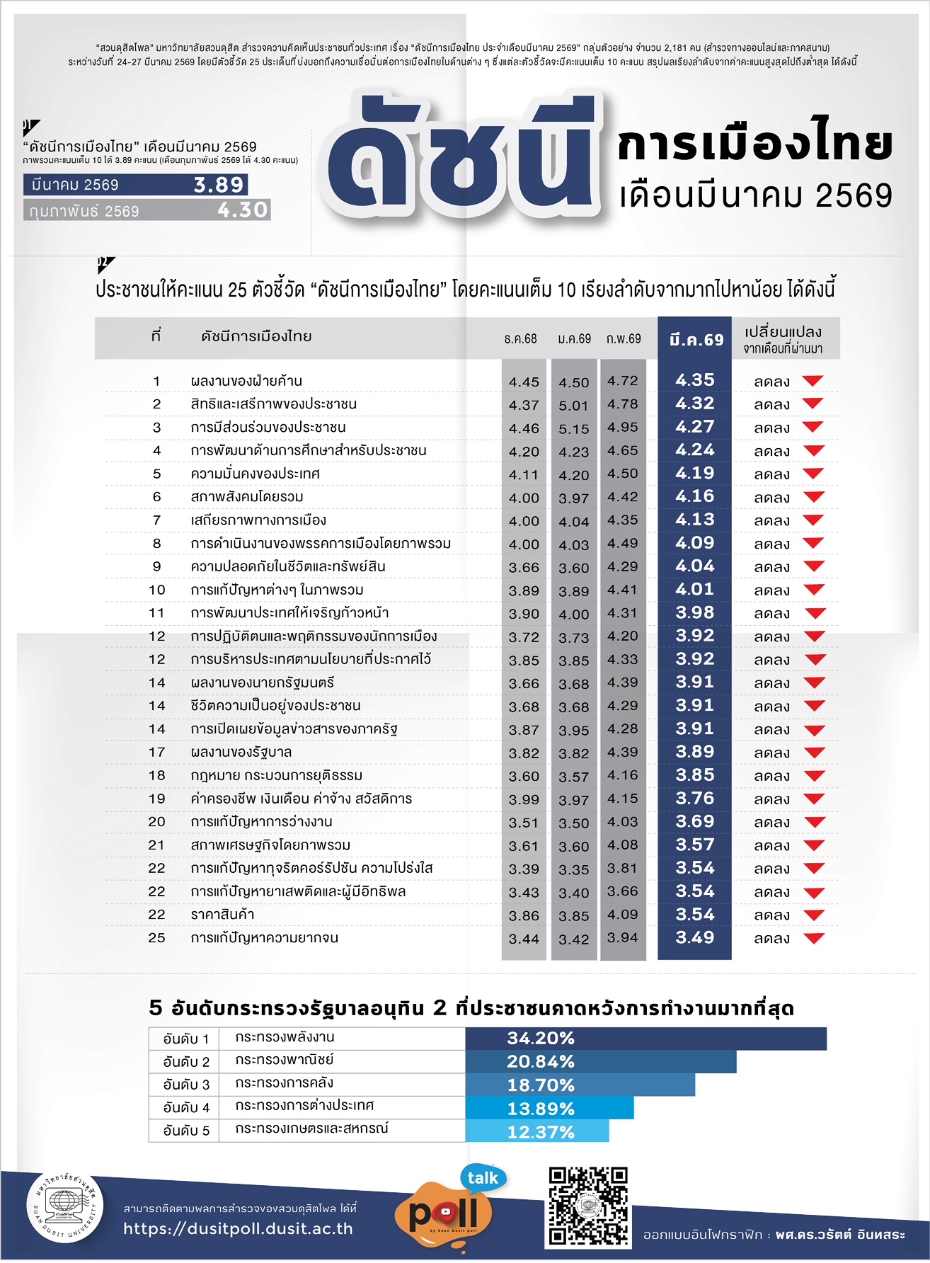 "สวนดุสิตโพล" มหาวิทยาลัยสวนดุสิต สำรวจความคิดเห็นประชาชนทั่วประเทศ เรื่อง "ดัชนีการเมืองไทย ประจำเดือนมีนาคม 2569" กลุ่มตัวอย่าง จำนวน 2,181 คน (สำรวจทางออนไลน์และภาคสนาม) ระหว่างวันที่ 24-27 มีนาคม 2569 โดยมีตัวชี้วัด 25 ประเด็นที่บ่งบอกถึงความเชื่อมั่นต่อการเมืองไทยในด้านต่าง ๆ ซึ่งแต่ละตัวชี้วัดจะมีคะแนนเต็ม 10 คะแนน