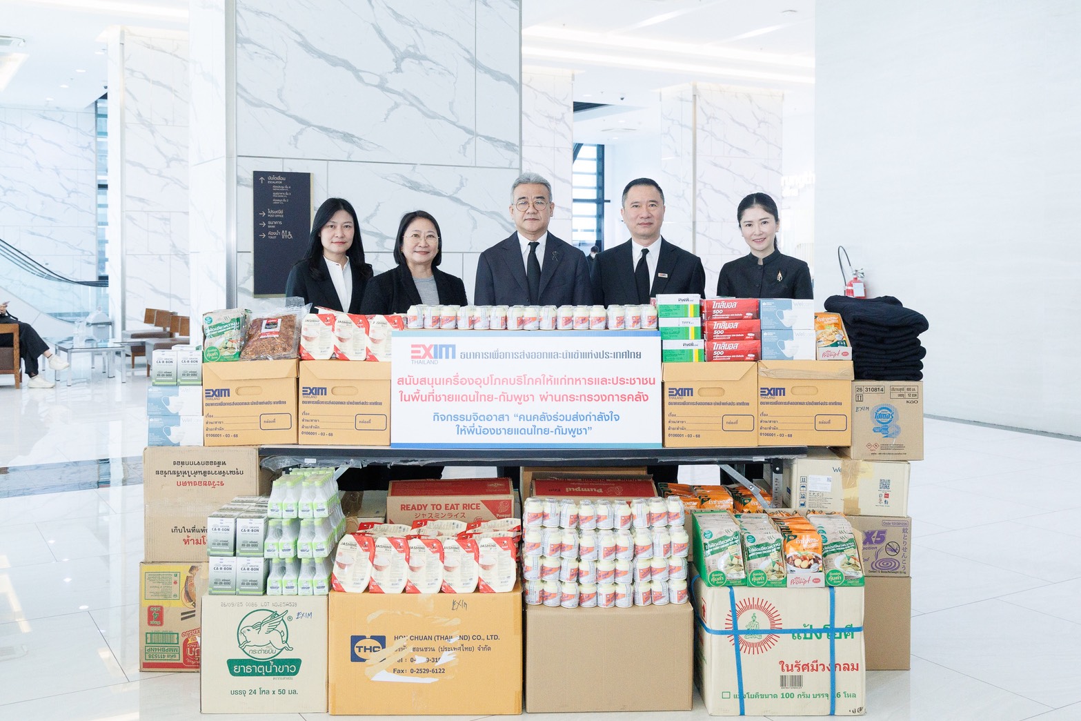 นายชลัช รัตนบุญนิธิ กรรมการผู้จัดการ และนางสาวดรัสวันต์ ชูวงษ์ รองกรรมการผู้จัดการ ธนาคารเพื่อการส่งออกและนำเข้าแห่งประเทศไทย (EXIM BANK) พร้อมด้วยผู้บริหาร EXIM BANK ส่งมอบเครื่องอุปโภคบริโภคให้แก่ทหารและประชาชนในพื้นที่ชายแดนไทย-กัมพูชา ผ่านกิจกรรมจิตอาสา
