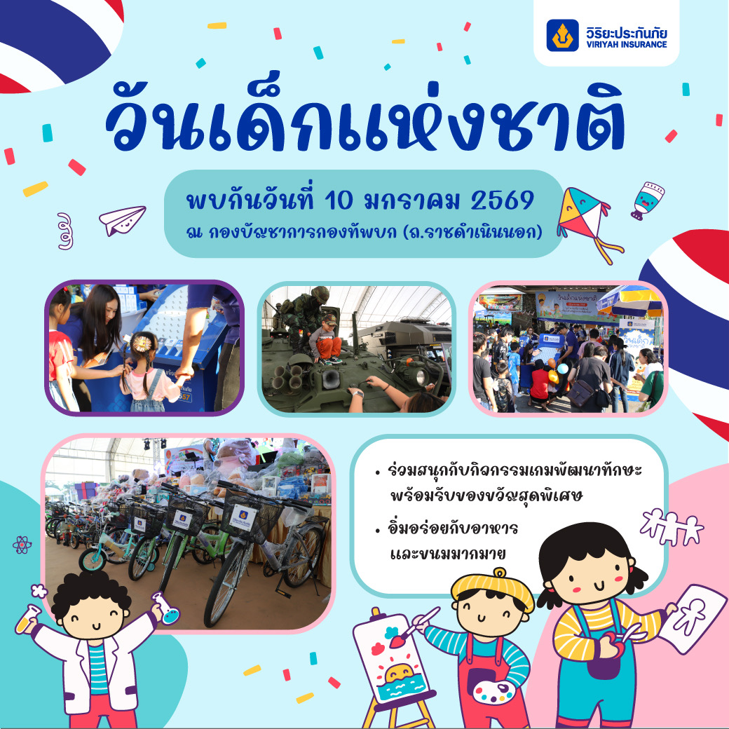 วันเด็กแห่งชาติประจำปีนี้ บริษัท วิริยะประกันภัย จำกัด (มหาชน) ร่วมสนับสนุน กองทัพบก (ทบ.) จัดงาน "วันเด็กแห่งชาติ ประจำปี 2569" เพื่อสร้างแรงบันดาลใจให้กับเด็กและเยาวชนได้เรียนรู้อย่างมีความสุข ผ่านกิจกรรมสร้างสรรค์ที่ช่วยเสริมสร้างพัฒนาการทางร่างกาย สติปัญญา และจิตใจ