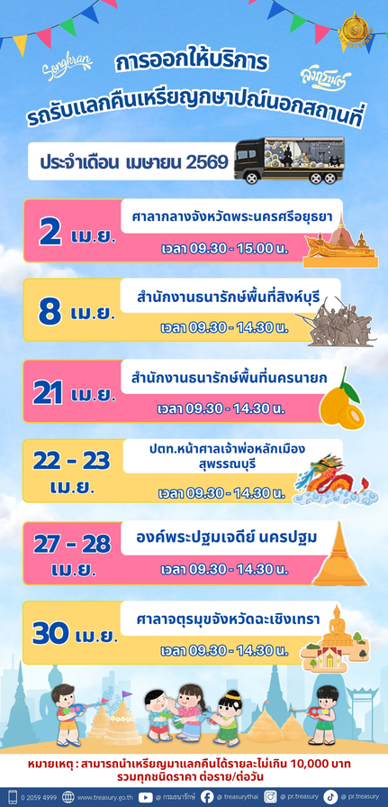 วันนี้ (31 มีนาคม 2569) กรมธนารักษ์โดยกองบริหารเงินตราจะนำรถรับแลกคืนเหรียญกษาปณ์เคลื่อนที่ (Mobile Coin Unit) ออกให้บริการรับแลกคืนเหรียญกษาปณ์ เพื่ออำนวยความสะดวกให้กับประชาชนที่มีเหรียญกษาปณ์ และมีความต้องการแลกคืนแต่ยังไม่สามารถเข้าถึงในการรับแลกคืนเหรียญได้ ประกอบด้วย เหรียญกษาปณ์หมุนเวียน ทุกชนิดราคา