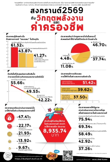 "สวนดุสิตโพล" มหาวิทยาลัยสวนดุสิต สำรวจความคิดเห็นประชาชนทั่วประเทศ เรื่อง"สงกรานต์ 2569 กับวิกฤตพลังงานและค่าครองชีพ" กลุ่มตัวอย่าง จำนวน 1,272 คน (สำรวจทางออนไลน์และภาคสนาม) ระหว่างวันที่ 31 มีนาคม - 3 เมษายน 2569 สรุปผลได้ ดังนี้