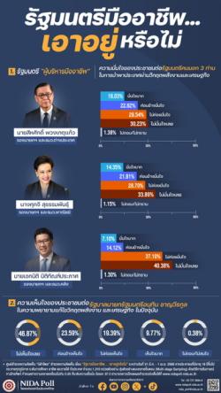 ศูนย์สำรวจความคิดเห็น "นิด้าโพล" สถาบันบัณฑิตพัฒนบริหารศาสตร์ (นิด้า) เปิดเผยผลการสำรวจ เรื่อง "รัฐมนตรีมืออาชีพ...เอาอยู่หรือไม่" ทำการสำรวจระหว่างวันที่ 31 มีนาคม - 1 เมษายน 2569 จากประชาชนที่มีอายุ 18 ปีขึ้นไป กระจายทุกภูมิภาค ระดับการศึกษา อาชีพ และรายได้ ทั่วประเทศ รวมจำนวนทั้งสิ้น 1,310 หน่วยตัวอย่าง