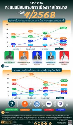ศูนย์สำรวจความคิดเห็น "นิด้าโพล" สถาบันบัณฑิตพัฒนบริหารศาสตร์ (นิด้า) เปิดเผยผลการสำรวจ เรื่อง "การสำรวจคะแนนนิยมทางการเมืองรายไตรมาส ครั้งที่ 4/2568" ทำการสำรวจระหว่างวันที่ 4-12 ธันวาคม 2568 จากประชาชนที่มีอายุ 18 ปีขึ้นไป กระจายทุกภูมิภาค ระดับการศึกษา อาชีพ และรายได้ ทั่วประเทศ รวมจำนวนทั้งสิ้น 2,500 หน่วยตัวอย่าง