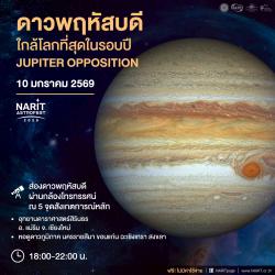 สถาบันวิจัยดาราศาสตร์แห่งชาติ (องค์การมหาชน) (สดร. หรือ NARIT) กระทรวงการอุดมศึกษา วิทยาศาสตร์ วิจัย และนวัตกรรม (อว.) เผย 10 มกราคม 2569 ดาวพฤหัสบดีใกล้โลกที่สุดในรอบปี เริ่มสังเกตได้ทางทิศตะวันออก หลังดวงอาทิตย์ลับขอบฟ้า ปรากฏสุกสว่างตลอดคืน สดร. ชวนส่องแถบเมฆ