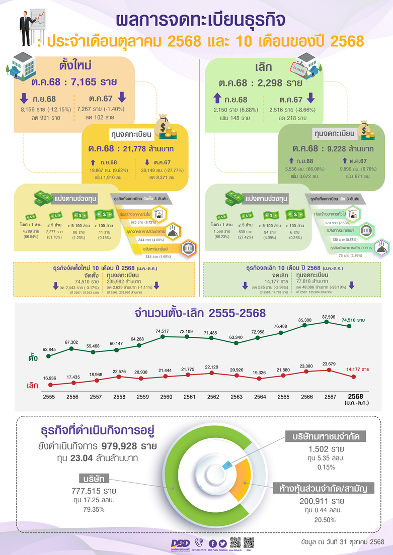 กรมพัฒนาธุรกิจการค้า เผยเดือนตุลาคม 2568 มีธุรกิจจัดตั้งใหม่ 7,165 ราย ทุนจดทะเบียนรวม 21,778 ล้านบาท แม้ทุนจดทะเบียนจะลดลงจากปีก่อน แต่ทุนเพิ่มขึ้นเมื่อเทียบกับเดือน ก.ย. 68 ขณะที่ 10 เดือนปี 2568 มีธุรกิจจัดตั้งใหม่รวม 74,510 ราย ทุนจดทะเบียนรวม 2.35 แสนล้านบาท ส่วนการลงทุนของต่างชาติ