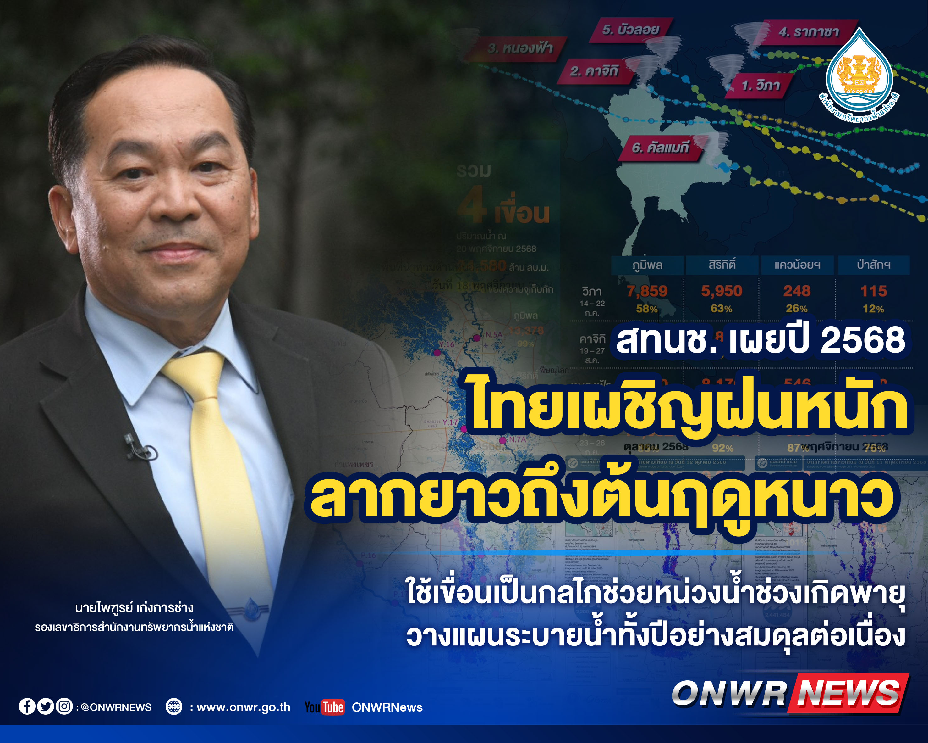 สทนช. เผย ไทยได้รับอิทธิพลจากพายุ 7 ลูก ทำให้ฝนตกยาวนานต่อเนื่องจนถึงต้นฤดูหนาว แม้มีการปรับแผนระบายน้ำล่วงหน้าตั้งแต่ต้นปีเพื่อเพิ่มพื้นที่รองรับฝน แต่มีน้ำไหลเข้าสะสมในเขื่อนใหญ่ต่อเนื่อง ปัจจุบันกำลังเร่งคลี่คลายสถานการณ์อุทกภัย เพื่อเข้าฟื้นฟูพื้นที่ที่ได้รับผลกระทบโดยเร็ว