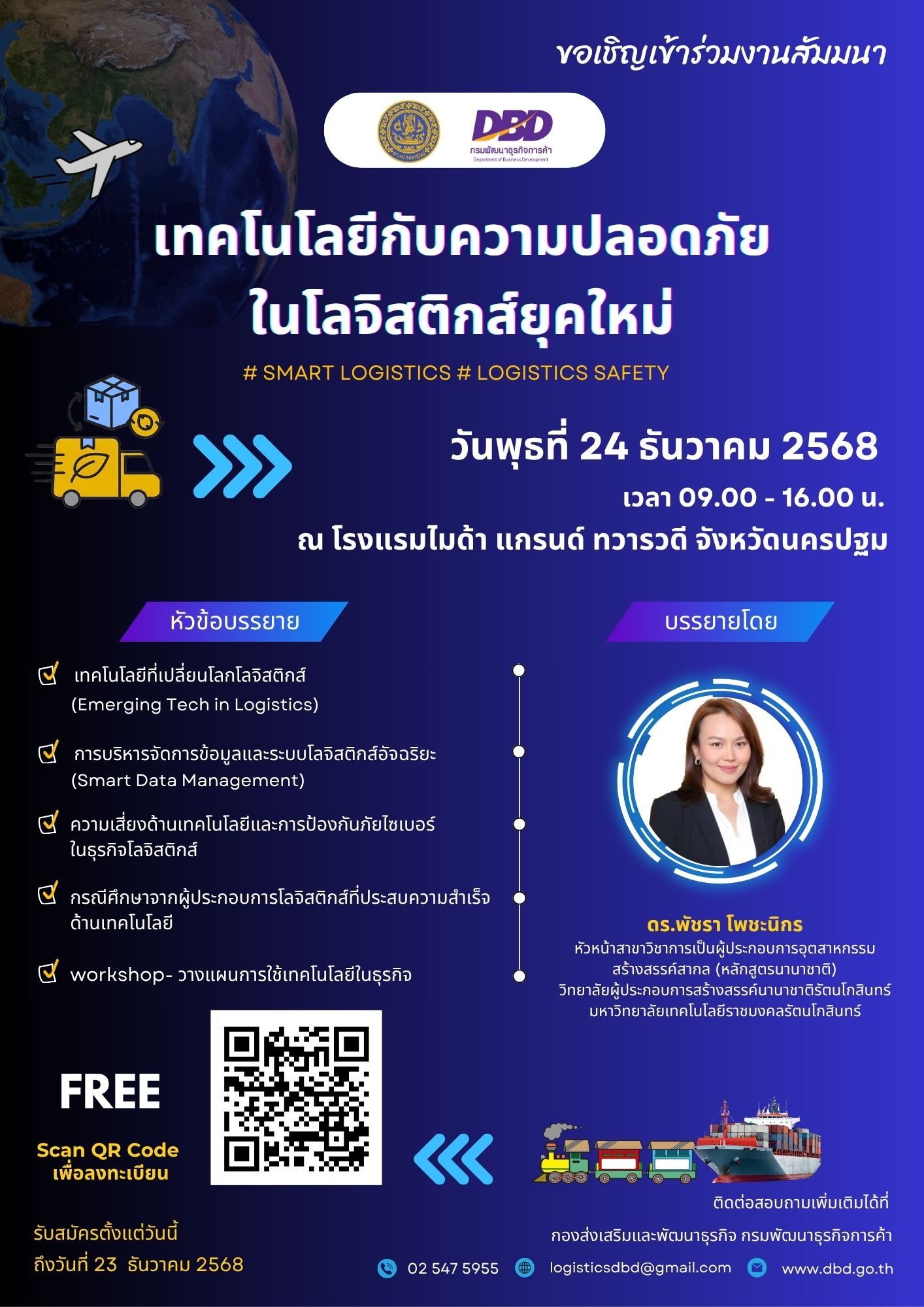 กรมพัฒนาธุรกิจการค้า ชวนผู้ประกอบธุรกิจให้บริการโลจิสติกส์และธุรกิจที่เกี่ยวเนื่อง สมัครเข้าร่วมสัมมนาเชิงปฏิบัติการ หลักสูตร "เทคโนโลยีกับความปลอดภัยในโลจิสติกส์ยุคใหม่" ในวันพุธที่ 24 ธันวาคม 2568 ณ โรงแรมไมด้า แกรนด์ ทวารวดี จังหวัดนครปฐม รีบสมัครก่อนที่นั่งจะเต็ม รับจำนวนจำกัดเพียง 80 ราย เท่านั้น!