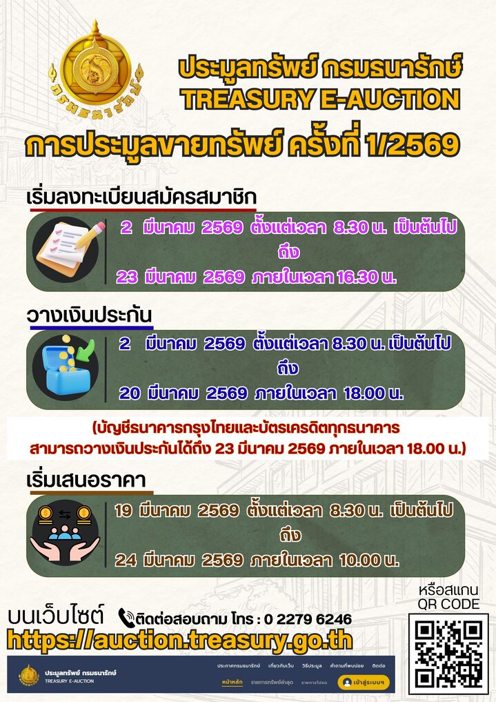 นายอัครุตม์ สนธยานนท์ อธิบดีกรมธนารักษ์ เปิดเผยว่า กรมธนารักษ์ได้ประกาศเปิดประมูลขายที่ราชพัสดุที่ตกเป็นของแผ่นดินตามคำพิพากษาของศาล ประเดิมรอบแรกของปี 2569 โดยมีทรัพย์สิน รวม 41 รายการ ครอบคลุมพื้นที่กรุงเทพฯ และ 20 จังหวัด ได้แก่ กระบี่ ชลบุรี ชัยภูมิ เชียงราย เชียงใหม่ ตรัง นครราชสีมา นนทบุรี
