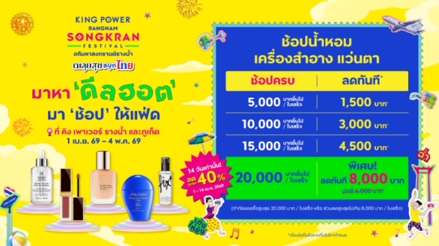 คิง เพาเวอร์ ฉลองเทศกาลสงกรานต์สุดยิ่งใหญ่ ในแคมเปญ "อภิมหาสงกรานต์ รางน้ำ THE JOY OF THAI ตะลุยสุข สนุกไทย" มาหาดีลฮอตกับส่วนลดแบบฉ่ำๆ สูงสุด 30% เมื่อช้อปสินค้าแผนกน้ำหอม เครื่องสำอางที่ร่วมรายการ เพียงช้อปทุก 5,000 บาท/ใบเสร็จ รับส่วนลดทันที 1,500 บาท ยิ่งช้อปเยอะ ยิ่งลดเพิ่ม!