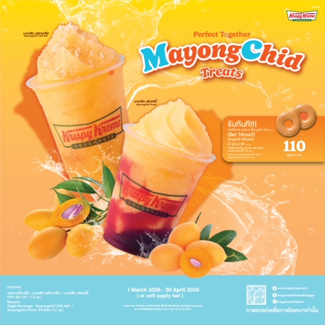 คริสปี้ ครีม ประเทศไทย (Krispy Kreme) ชวนคุณเติมความเฟรชให้เย็นชุ่มฉ่ำต้อนรับซัมเมอร์นี้กับเครื่องดื่มสุดพิเศษ "Krispy Kreme Mayongchid Treats Perfect Together" ที่นำผลไม้ไทยยอดนิยมประจำฤดูกาลอย่าง มะยงชิด ซึ่งออกผลเพียงปีละครั้ง มารังสรรค์เป็นเมนูปั่นแสนอร่อย 2 แบบ 2 สไตล์ ได้แก่ มะยงชิด พริกเกลือ (Mayongchid Chili Salt)