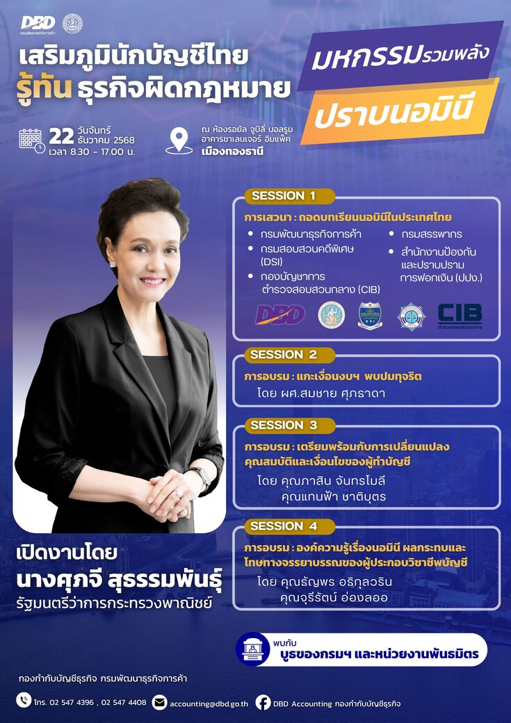 กรมพัฒนาธุรกิจฯ ขอความร่วมมือ 'สำนักงานบัญชี' และ 'นักบัญชี' อย่าให้ความช่วยเหลือสนับสนุนจัดตั้งธุรกิจที่เป็น 'นอมินี' และ จดทะเบียนธุรกิจเพื่อเปิด 'บัญชีม้านิติบุคคล' พร้อมเตรียมจัดมหกรรมรวมพลังนักบัญชีรู้ทันธุรกิจผิดกฎหมาย