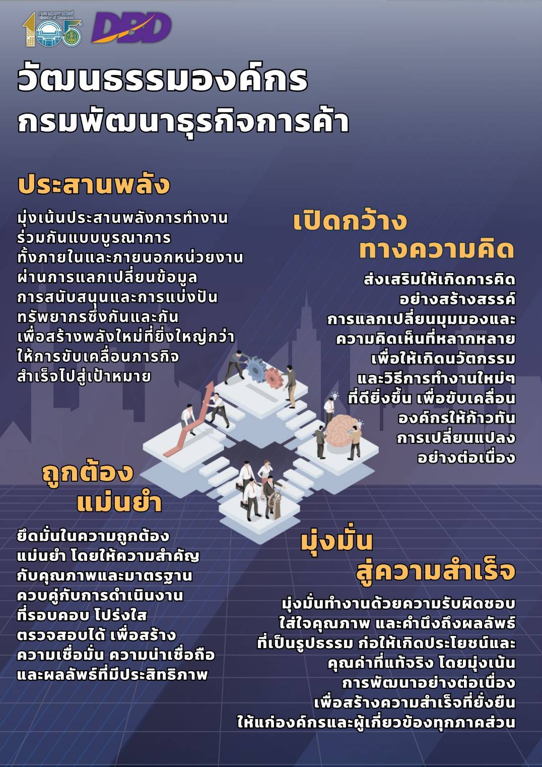 กรมพัฒนาธุรกิจการค้า เผยทิศทางสร้างวัฒนธรรมองค์กรของกรมพัฒนาธุรกิจการค้าซึ่งถือเป็นหัวใจสำคัญของการพ...