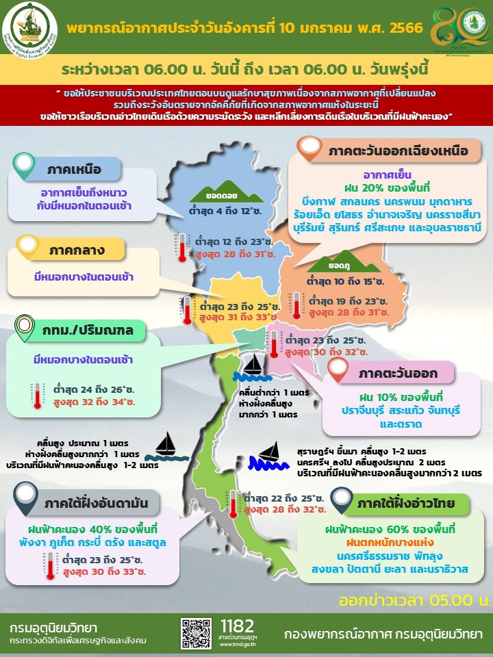 กรมอุตุนิยมวิทยา พยากรณ์อากาศ 24 ชั่วโมงข้างหน้า วันที่ 10 มกราคม 2566 บริเวณความกดอากาศสูงหรือมวลอากาศเย็นยังคงปกคลุมประเทศไทยตอนบนและทะเลจีนใต้ ทำให้ภาคเหนือยังคงมีอากาศเย็นถึงหนาวกับมีหมอกในตอนเช้า ส่วนภาคตะวันออกเฉียงเหนือมีอากาศเย็นในตอนเช้า โดยมีฝนบางแห่งบริเวณภาคตะวันออกเฉียงเหนือและภาคตะวันออก ขอให้ประชาชนบริเวณประเทศไทยตอนบนดูแลรักษาสุขภาพเนื่องจากสภาพอากาศที่เปลี่ยนแปลง รวมถึงระวังอันตรายจากอัคคีภัยที่เกิดจากสภาพอากาศแห้งไว้ด้วย