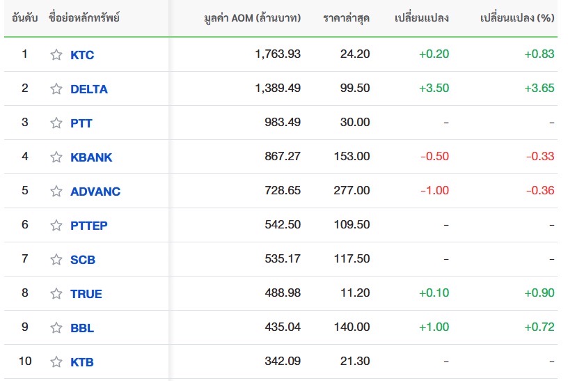 10 อันดับหลักทรัพย์ที่มีมูลค่าการซื้อขายสูงสุด