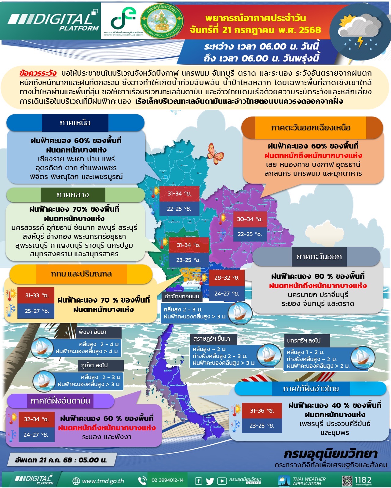 กรมอุตุนิยมวิทยา พยากรณ์อากาศ 24 ชั่วโมงข้างหน้า วันที่ 21 กรกฎาคม 2568 ประเทศไทยมีฝนตกหนักบางพื้นที่ โดยจะมีฝนตกหนักมากบางแห่งบริเวณจังหวัดบึงกาฬ นครพนม จันทบุรี ตราด และระนอง ขอให้ประชาชนในบริเวณดังกล่าวระวังอันตรายจากฝนตกหนักถึงหนักมากและฝนที่ตกสะสม ซึ่งอาจทำให้เกิดน้ำท่วมฉับพลัน น้ำป่าไหลหลาก โดยเฉพาะพื้นที่ลาดเชิงเขาใกล้ทางน้ำไหลผ่านและพื้นที่ลุ่ม ทั้งนี้เนื่องจากมรสุมตะวันตกเฉียงใต้กำลังแรงพัดปกคลุมทะเลอันดามัน ประเทศไทย และอ่าวไทย