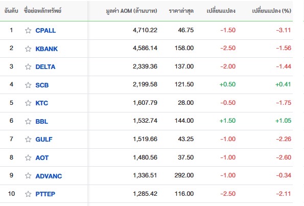 10 อันดับหลักทรัพย์ที่มีมูลค่าการซื้อขายสูงสุด