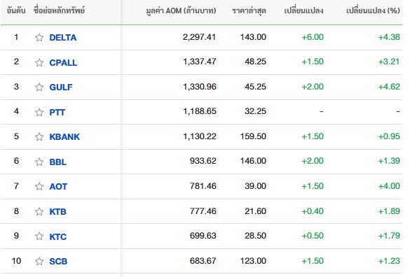10 อันดับหลักทรัพย์ที่มีมูลค่าการซื้อขายสูงสุด