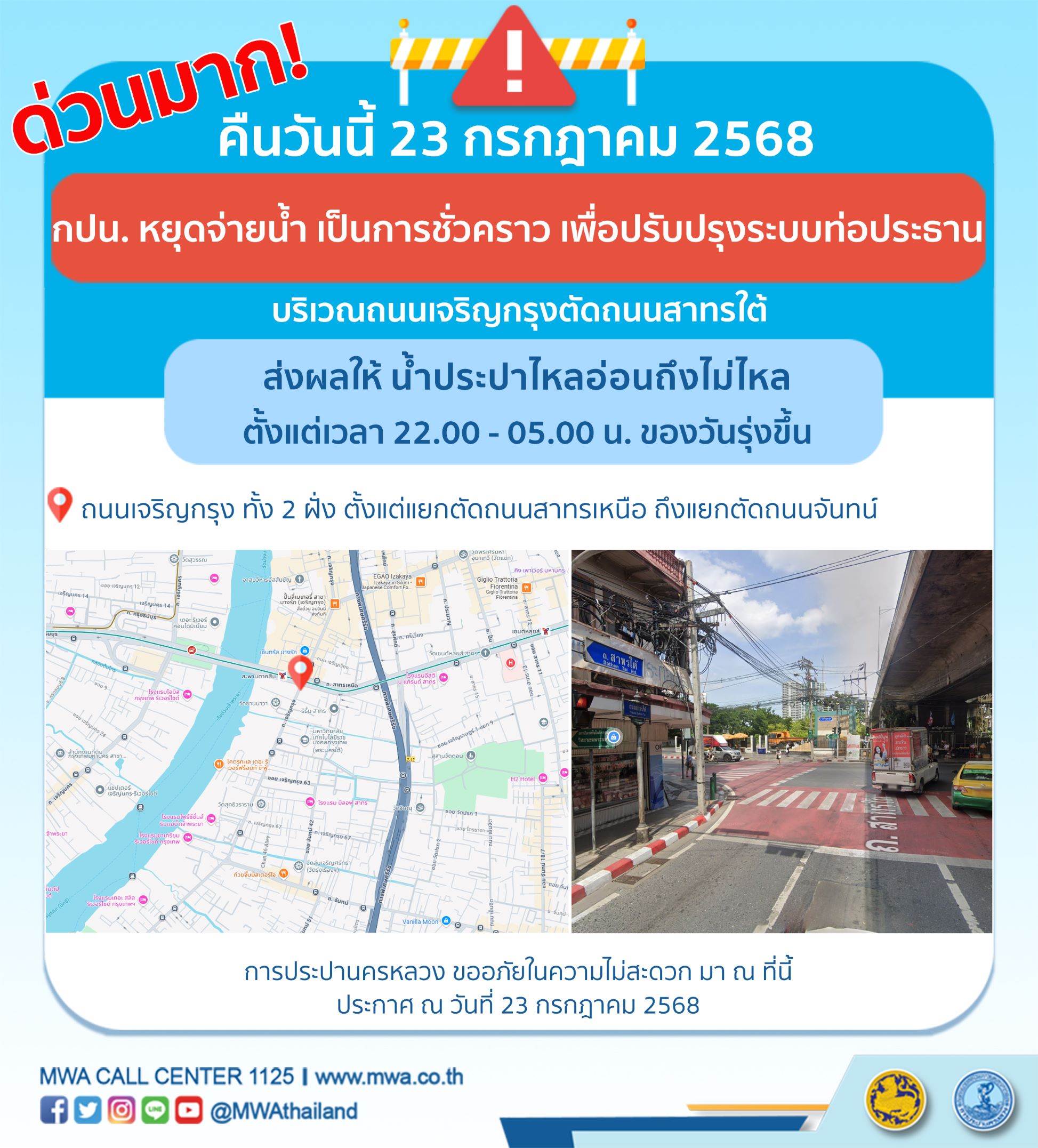 การประปานครหลวง (กปน.) ขอแจ้งให้ทราบว่า จะดำเนินการปรับปรุงระบบท่อประธาน ในพื้นที่บริเวณถนนเจริญกรุงตัดถนนสาทรใต้ เพื่อให้ประชาชนได้รับบริการน้ำประปาอย่างเพียงพอและทั่วถึง จึงมีความจำเป็นต้องหยุดจ่ายน้ำ เป็นการชั่วคราว ในคืนวันนี้ (วันพุธที่ 23 กรกฎาคม 2568) ตั้งแต่เวลา 22.00 - 05.00 น. ของวันรุ่งขึ้น โดยระหว่างดำเนินการ ส่งผลให้ น้ำประปาไหลอ่อนถึงไม่ไหล ในพื้นที่ดังต่อไปนี้