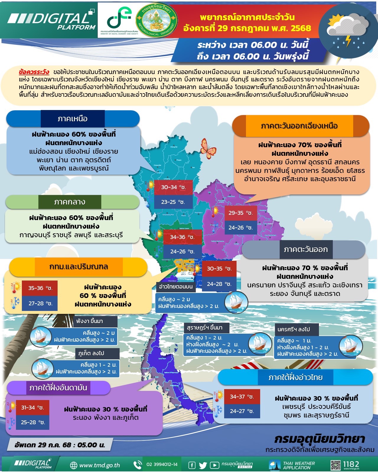 กรมอุตุนิยมวิทยา พยากรณ์อากาศ 24 ชั่วโมงข้างหน้า วันที่ 29 กรกฎาคม 2568 ภาคเหนือตอนบน ภาคตะวันออกเฉียงเหนือตอนบน ภาคกลาง และภาคตะวันออก มีฝนตกหนักบางแห่ง โดยเฉพาะบริเวณจังหวัดเชียงราย พะเยา น่าน ตาก บึงกาฬ นครพนม จันทบุรี และตราด ขอให้ประชาชนในบริเวณดังกล่าวระวังอันตรายจากฝนตกหนักและฝนที่ตกสะสมซึ่งอาจทำให้เกิดน้ำท่วมฉับพลัน น้ำป่าไหลหลาก และน้ำล้นตลิ่ง โดยเฉพาะพื้นที่ลาดเชิงเขาใกล้ทางน้ำไหลผ่านและพื้นที่ลุ่ม ทั้งนี้เนื่องจากมีหย่อมความกดอากาศต่ำบริเวณประเทศเวียดนามตอนบน ประกอบกับมรสุมตะวันตกเฉียงใต้กำลังปานกลางพัดปกคลุมทะเลอันดามันประเทศไทย และอ่าวไทย