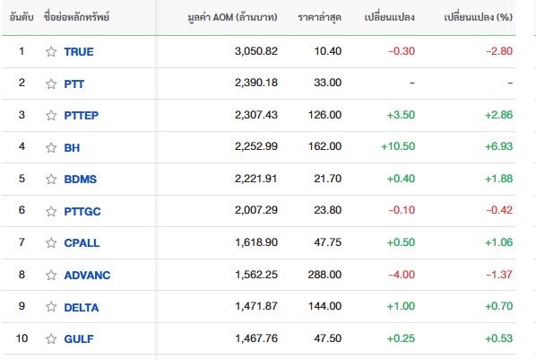 10 อันดับหลักทรัพย์ที่มีมูลค่าการซื้อขายสูงสุด