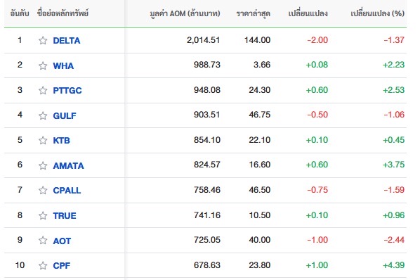10 อันดับหลักทรัพย์ที่มีมูลค่าการซื้อขายสูงสุด