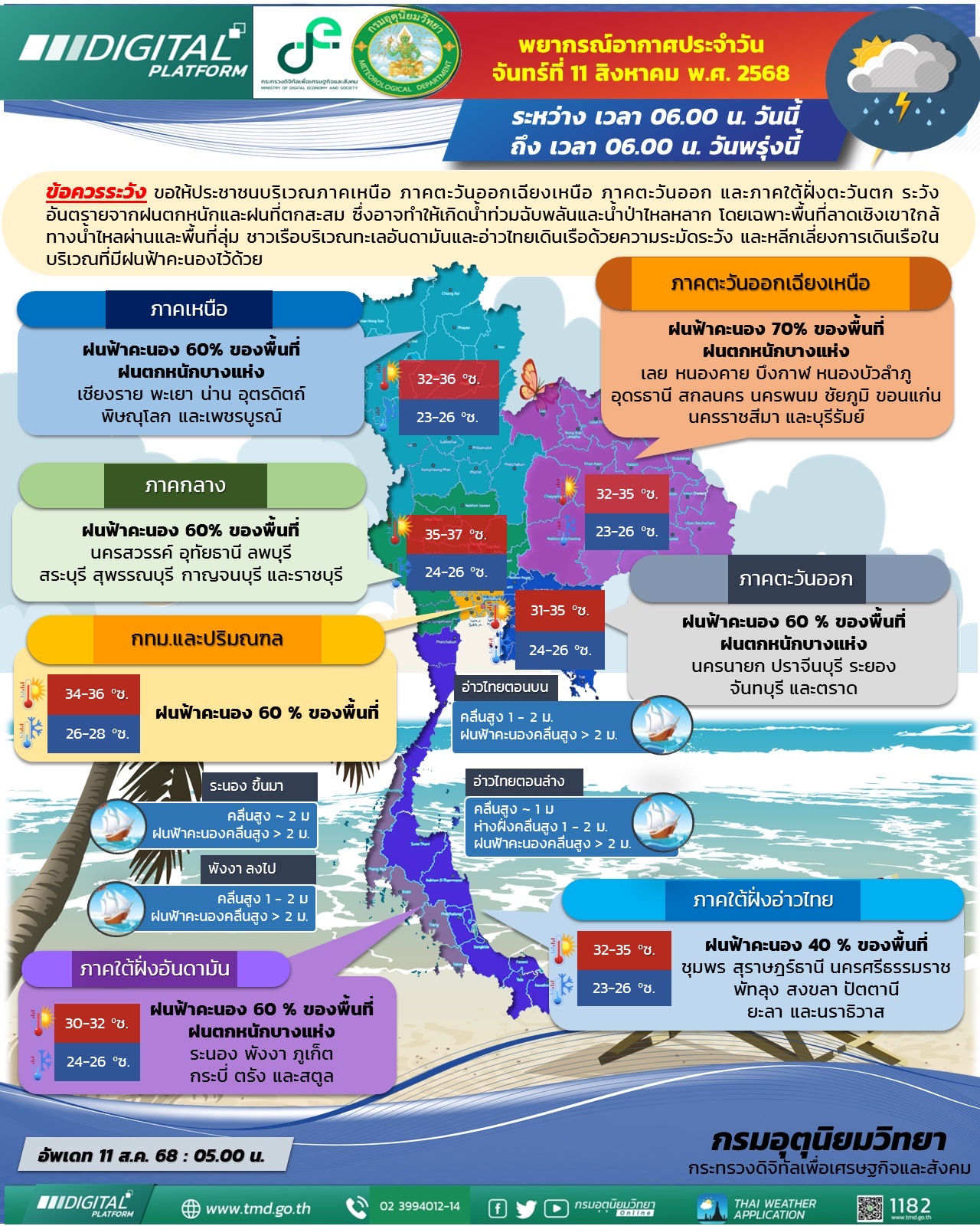 กรมอุตุนิยมวิทยา พยากรณ์อากาศ 24 ชั่วโมงข้างหน้า วันที่ 11 สิงหาคม 2568 ภาคเหนือ ภาคตะวันออกเฉียงเหนือ ภาคตะวันออก และภาคใต้ฝั่งตะวันตก มีฝนตกหนักบางแห่ง ขอให้ประชาชนในบริเวณดังกล่าวระวังอันตรายจากฝนตกหนักและฝนที่ตกสะสม ซึ่งอาจทำให้เกิดน้ำท่วมฉับพลันและน้ำป่าไหลหลาก โดยเฉพาะพื้นที่ลาดเชิงเขาใกล้ทางน้ำไหลผ่านและพื้นที่ลุ่มไว้ด้วย เนื่องจากมีร่องมรสุมพาดผ่านประเทศลาวตอนบน และประเทศเวียดนามตอนบน ประกอบกับมรสุมตะวันตกเฉียงใต้ที่พัดปกคลุมทะเลอันดามัน ประเทศไทย และอ่าวไทยมีกำลังแรงขึ้น