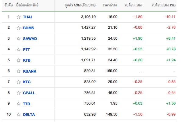 10 อันดับหลักทรัพย์ที่มีมูลค่าการซื้อขายสูงสุด